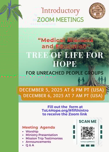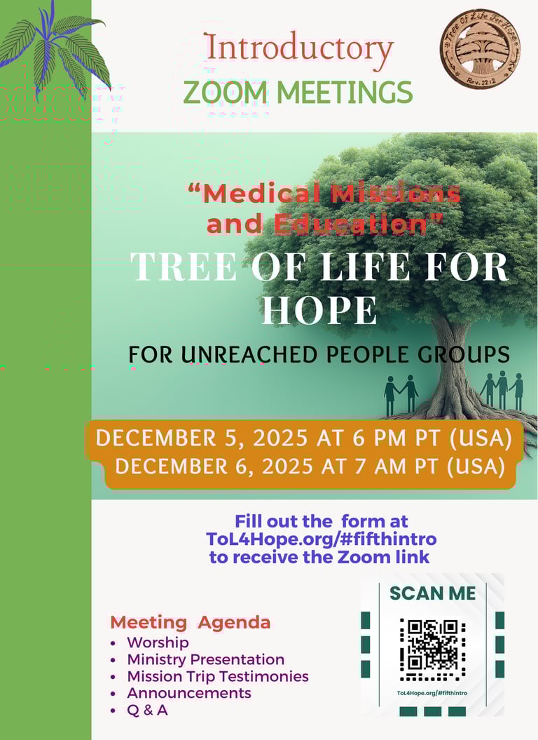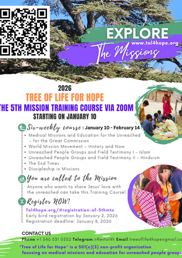 "Tree of Life for Hope" offers a Mission Training Course (ToL4Hope MTC) via Zoom with weekly classes over six Saturdays. This course is designed to help individuals understand the importance of medical missions and education for unreached people groups and equip them to serve these communities actively. It is also a prerequisite for those who wish to join ToL4Hope Mission Trips.